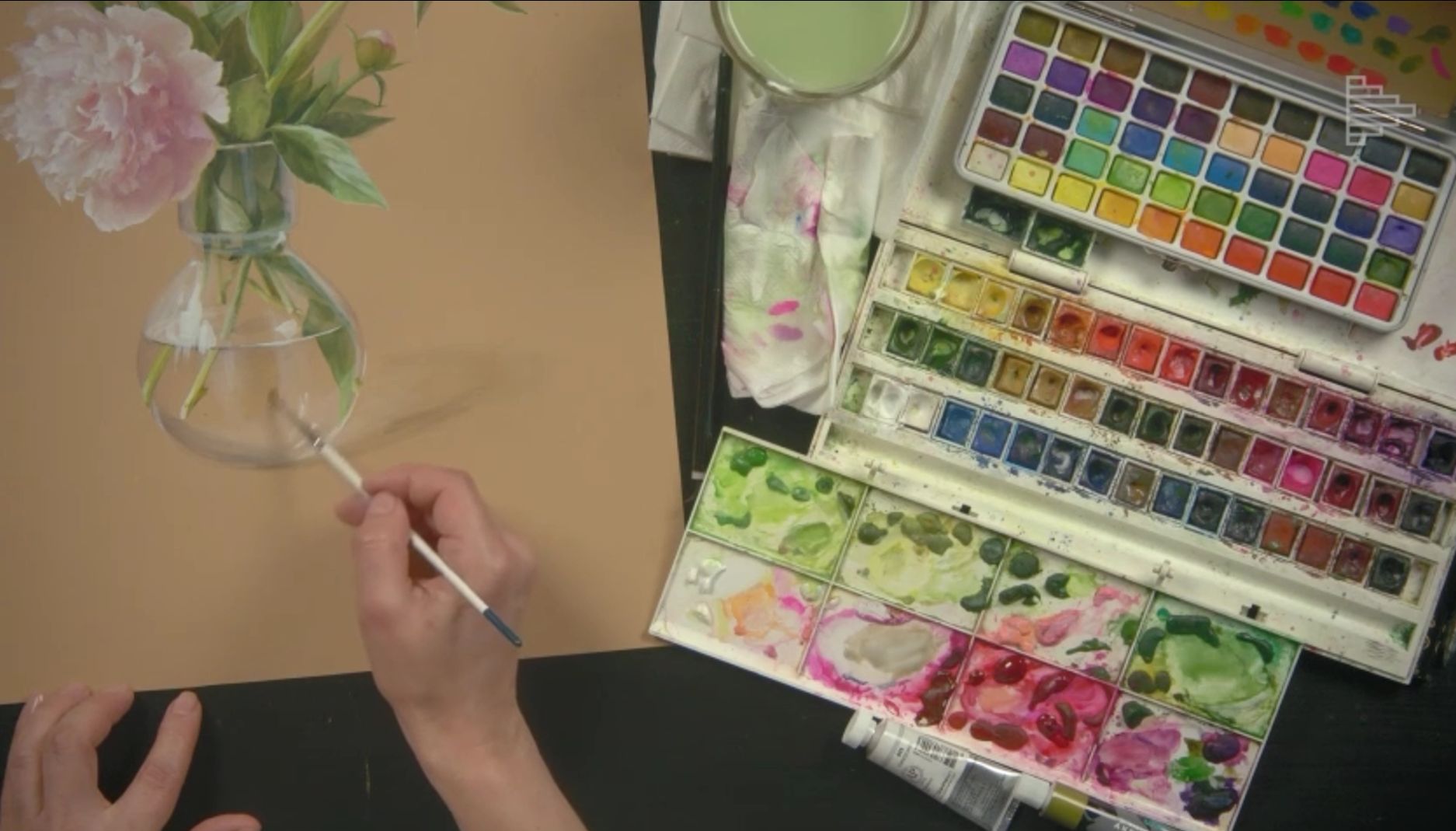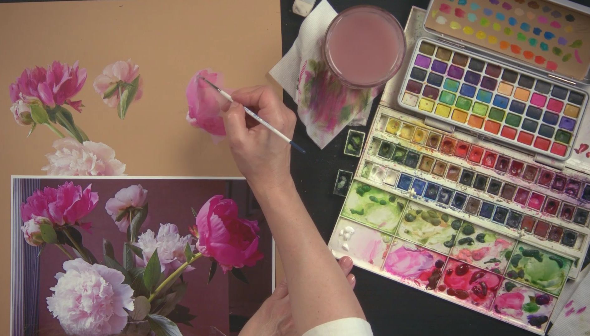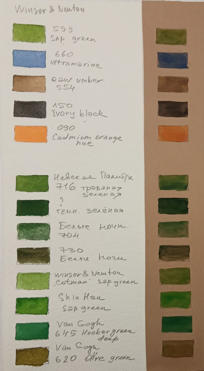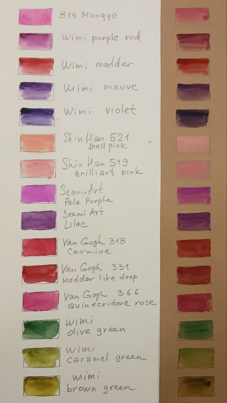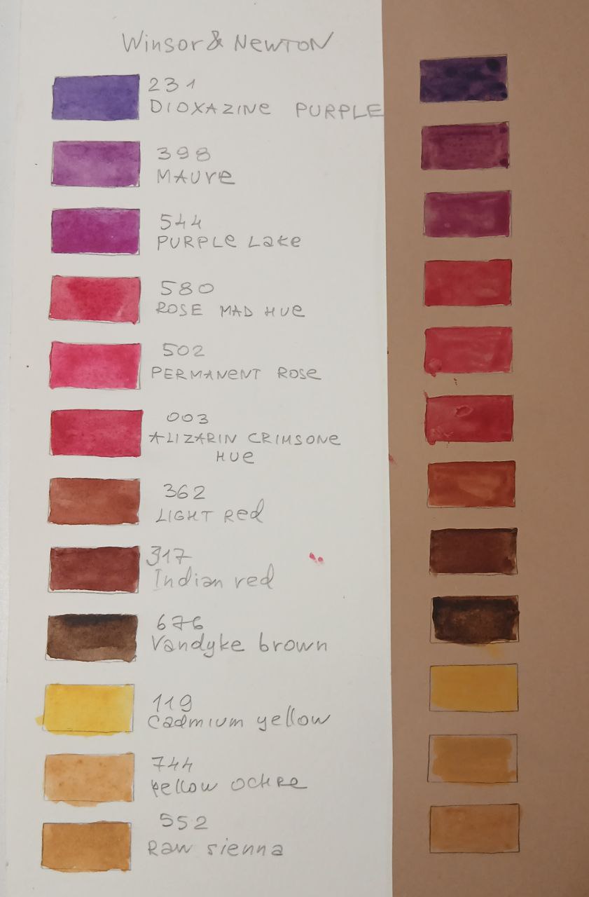 Понадобится профессиональная акварель следующих цветов: Mungyo Opera №814, Wimi purple red, Van Gogh Madder Lake Deep №331, Winsor&Newton Mauve №398, Van Gogh rose quinacridone №366, Winsor&Newton light red №362, ShinHan sap green №416, Wimi caramel green, Winsor&Newton sap green №599, Wimi caramel green, Winsor&Newton sap green №599, Winsor&Newton Indian red №317, Winsor&Newton vandyke brown №676, Невская палитра Белые ночи №716 травяная зеленая, Winsor&Newton cadmium yellow №119, Winsor&Newton purple lake №544, Winsor &Newton rose mad hue №580, Seami Art Pale Purple, Seami Art Lilac, Wimi mauve, Wimi brown green, Wimi olive green, Van Gogh olive green №620, Белые ночи №730 земля зеленая, Белые ночи №704 окись хрома, Winsor&Newton Raw sienna №552, Winsor&Newton yellow ochre №744, ShinHan shell pink №521, ShinHan brilliant pink №519, Van Gogh hooker green deep №645, Van Gogh carmine №318, Winsor&Newton №660 ультрамарин, Winsor&Newton cadmium orange hue №090, PWC shell pink №521, PWC brilliant pink №519, Seami Art yellow green, Seami Art light yellow olive green, Winsor & Newton raw umber №008, Seami Art permanent green, Seami Art olive green, Wimi violet, Winsor&Newton №331 ivory black. Можно подобрать аналогичные цвета у других производителей акварели. Выкраски перечисленных цветов акварели ЗДЕСЬ, ЗДЕСЬ, ЗДЕСЬ и ЗДЕСЬ.