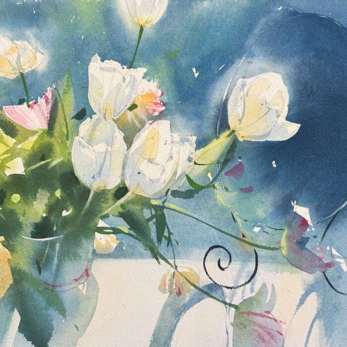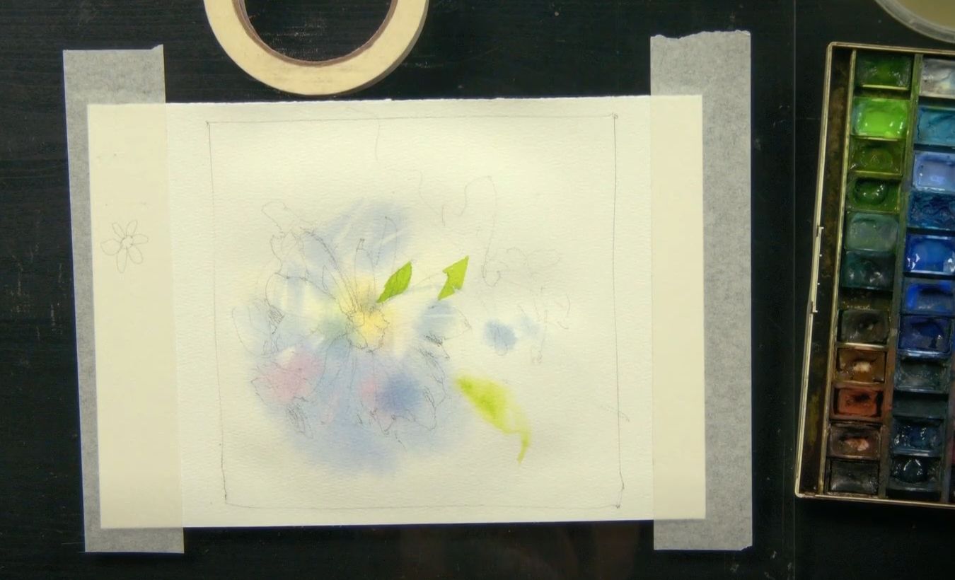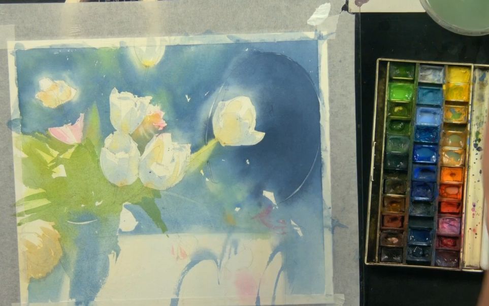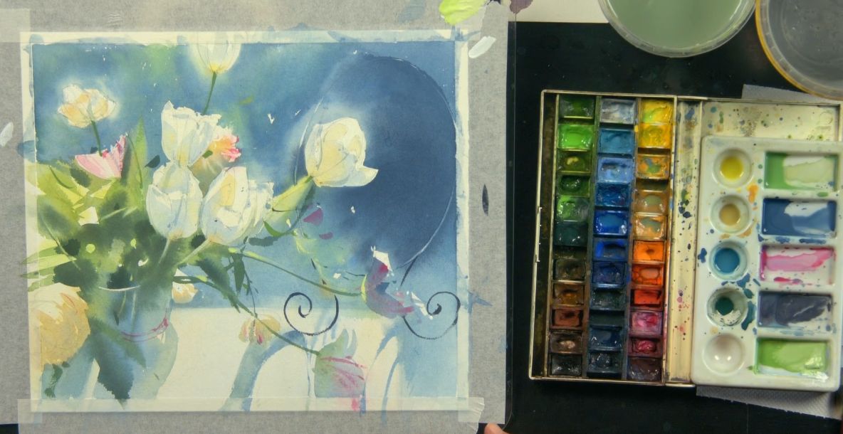 Профессиональный набор акварели от 24 цветов следующих марок: Enterclass, Гамма, Pinax, Белые ночи, Schmincke, Van Gogh, W&N, Lukas или др. Краски могут быть в кюветах или в тюбиках. Понадобятся следующие цвета акварели: лимонная желтая, охра светлая, неаполитанская желтая, хинакридон розовый, коралловая, королевская голубая, кобальт синий, индиго, ультрамарин, серо-розовая дымка, майская зеленая, травяная зеленая, окись хрома, таежная дымка. Также может понадобиться гуашь титановая (белила).