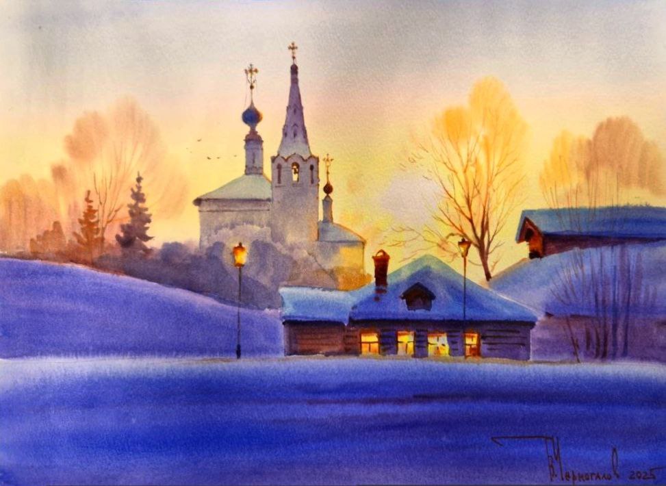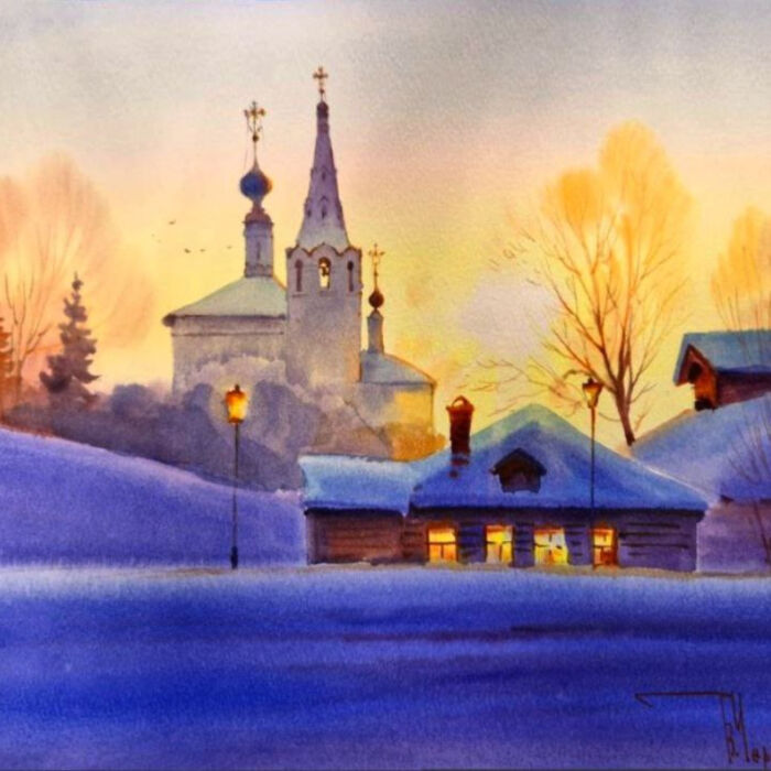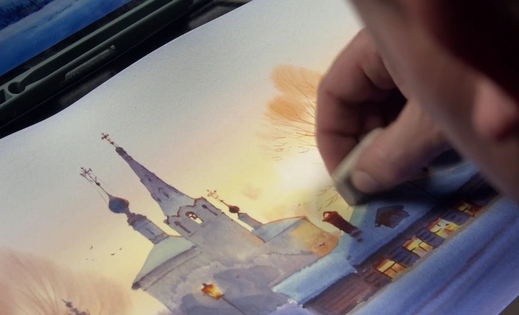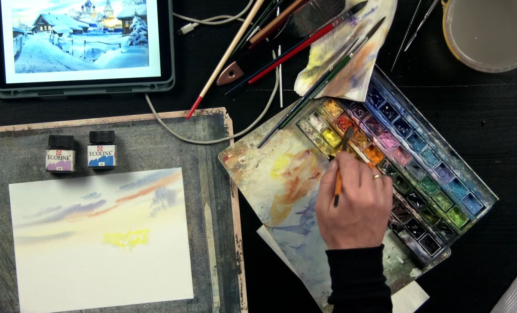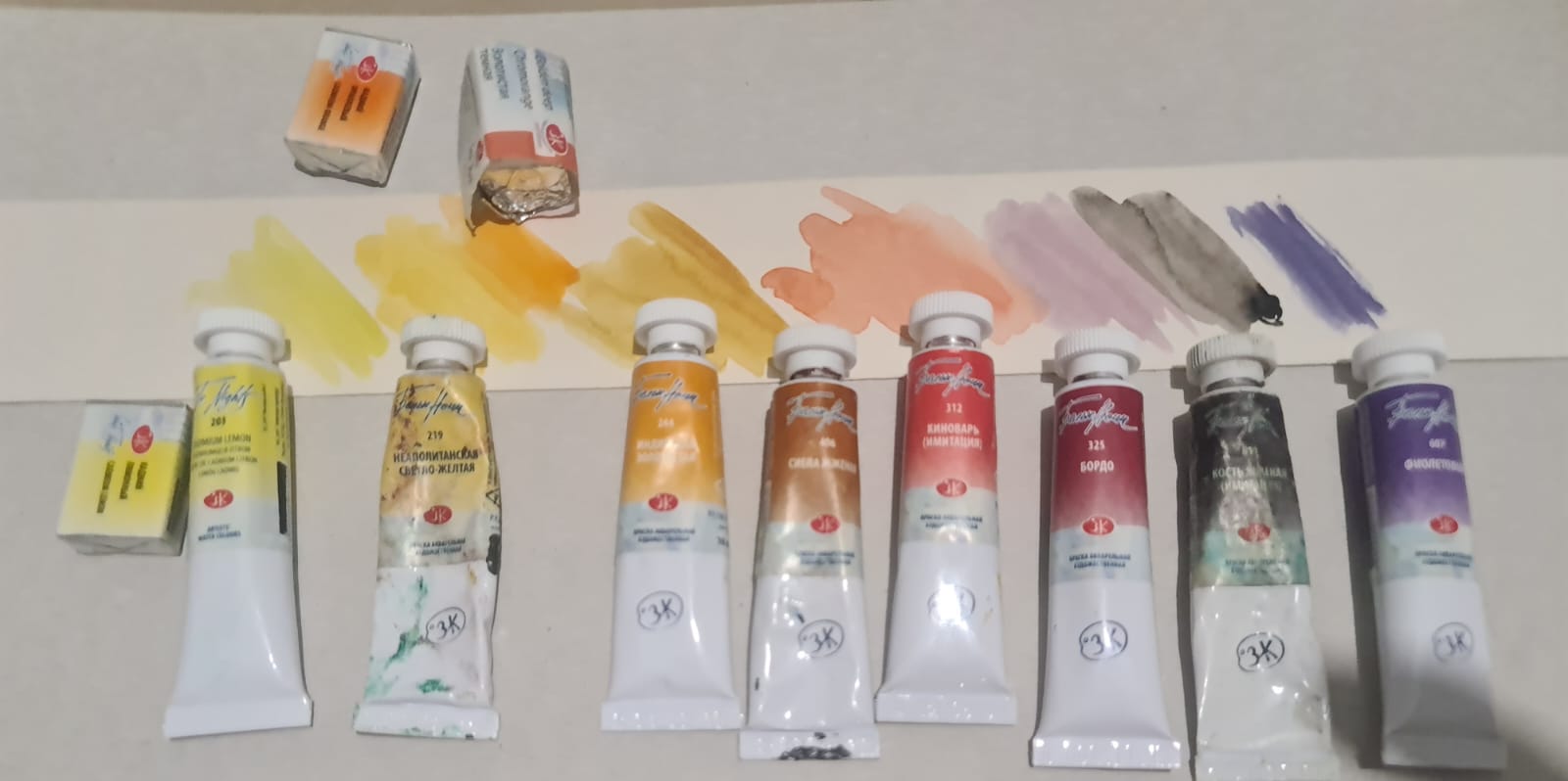 Профессиональный набор акварели от 24 цветов следующих марок: Enterclass, Гамма, Pinax, Белые ночи, Daniel Smith., Schmincke, Van Gogh, W&N, Lukas или др. Краски могут быть в кюветах или в тюбиках. Понадобятся следующие цвета акварели (приведены цвета из Невской палитры): индийская золотистая, сиена жженая, киноварь, бордо, кость жженая, фиолетовый, кадмий оранжевый, золотистая темная, кадмий лимонный, неаполитанская светло-желтая, лак синий, ярко-голубая,ультрамарин темный, фиолетовый хинакридон, серо-розовая дымка.