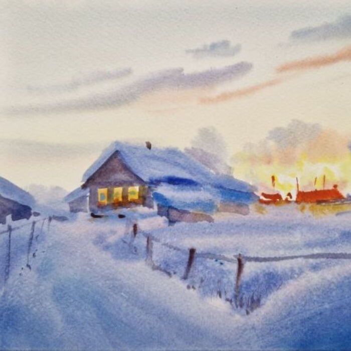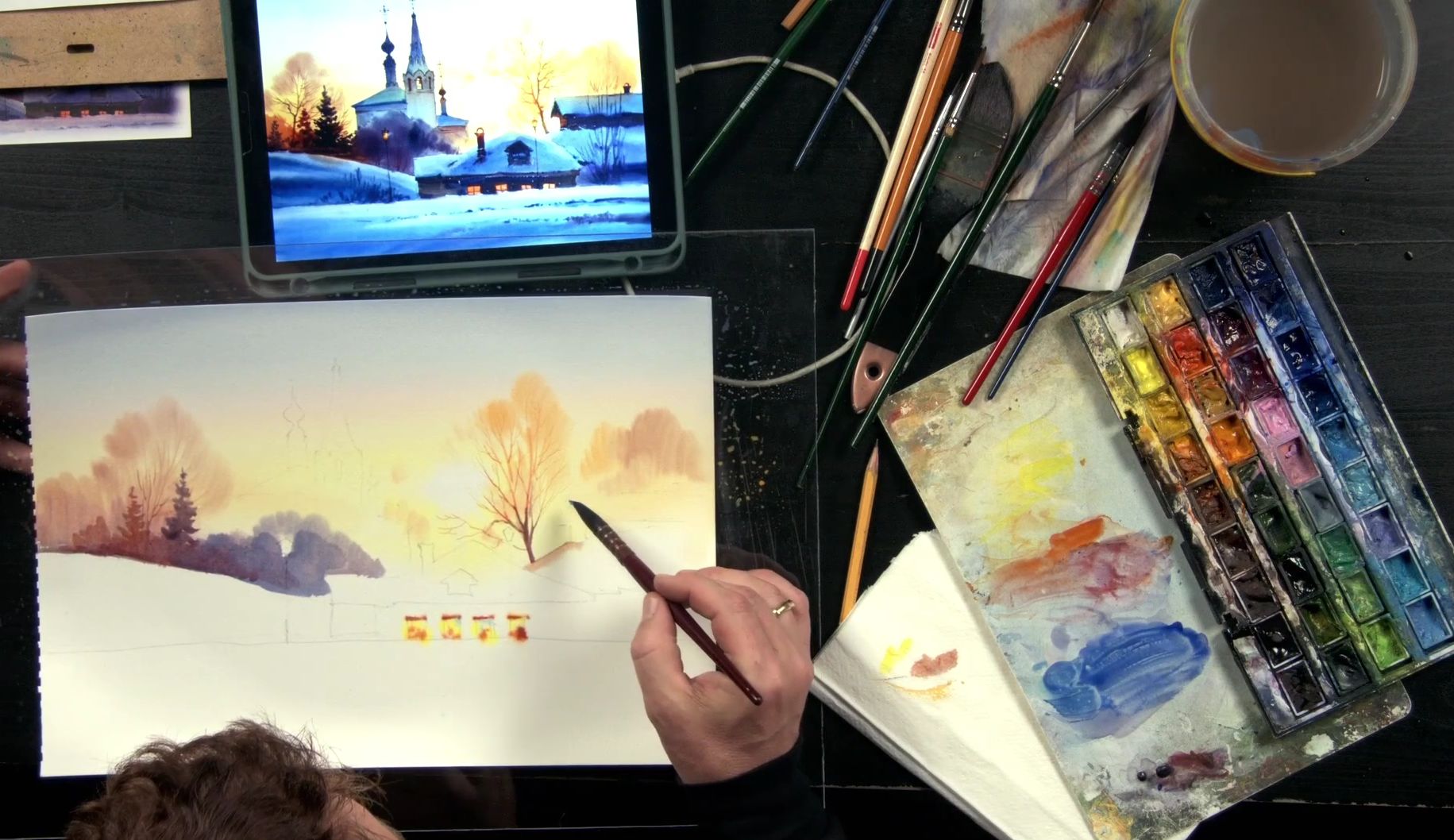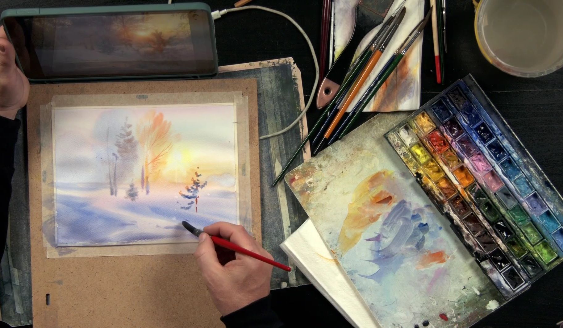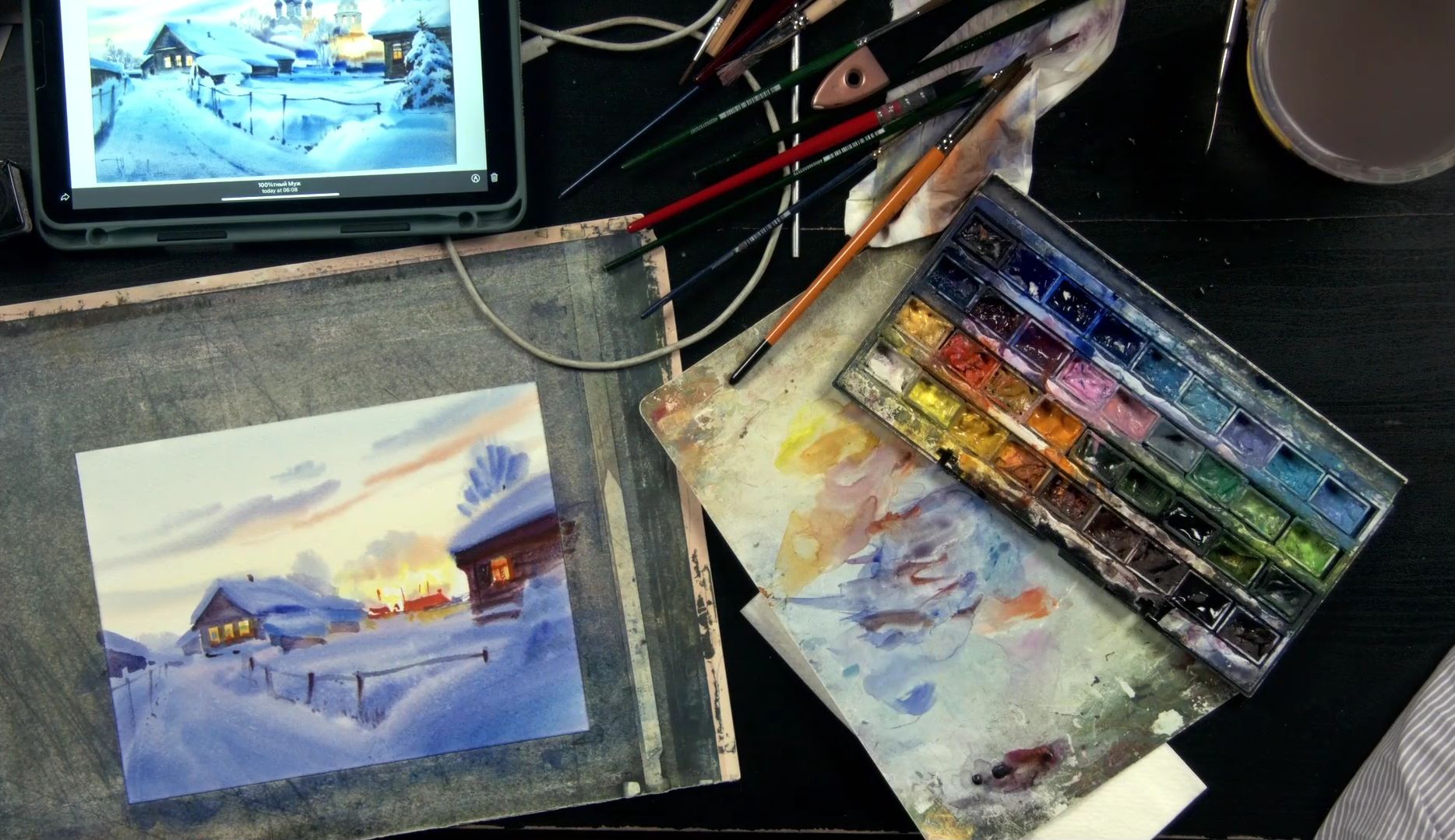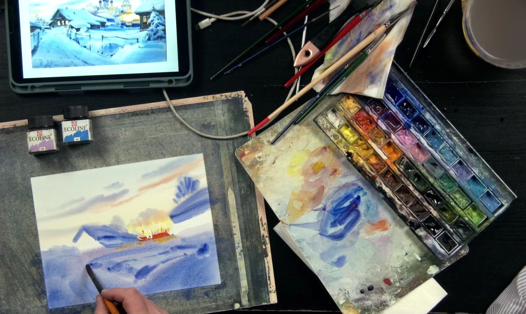Акварельная бумага, плотностью 180-300 г/м2, 100% хлопок или смесь, среднее зерно или сатин. Например, следующих производителей: Saunders Waterford, Arches, Baohong, Canson Watercolor , наши бумаги: Белые Ночи, Малевич и др. (кроме Палаццо и Поль Рубенс). Размер основной работы А3, для первого часа — 18*24 см.