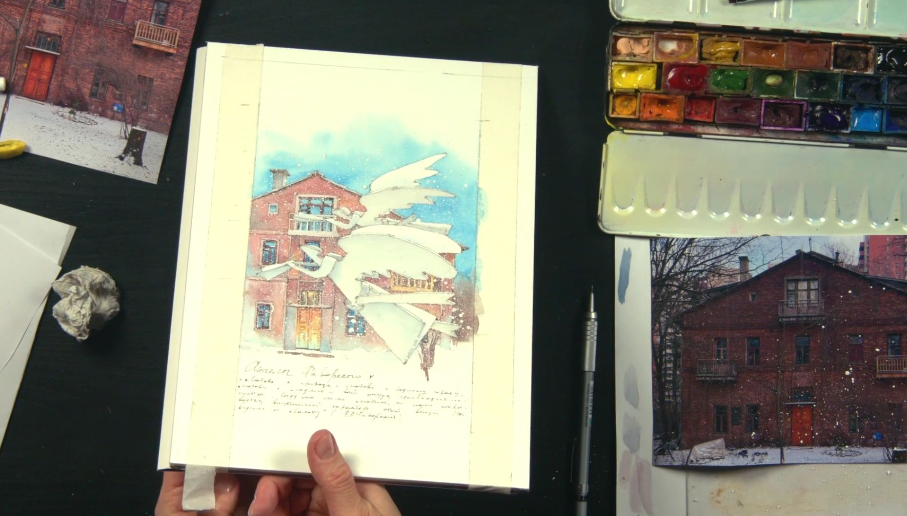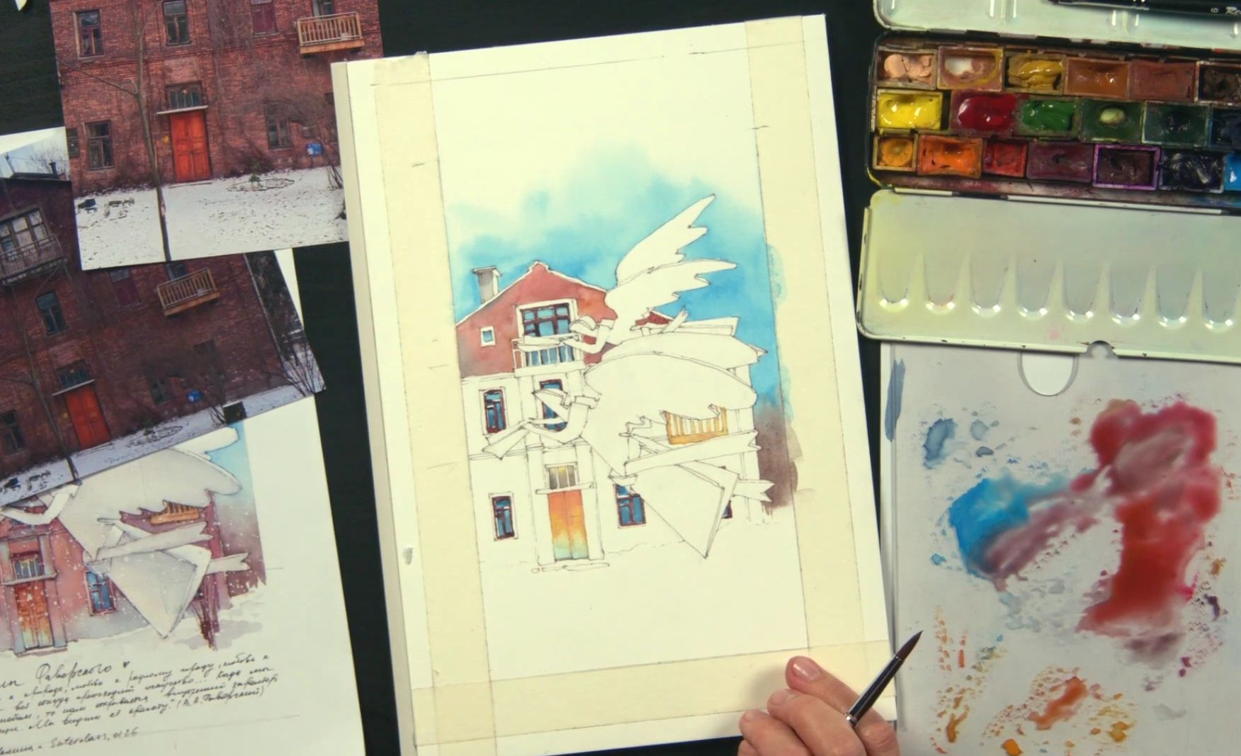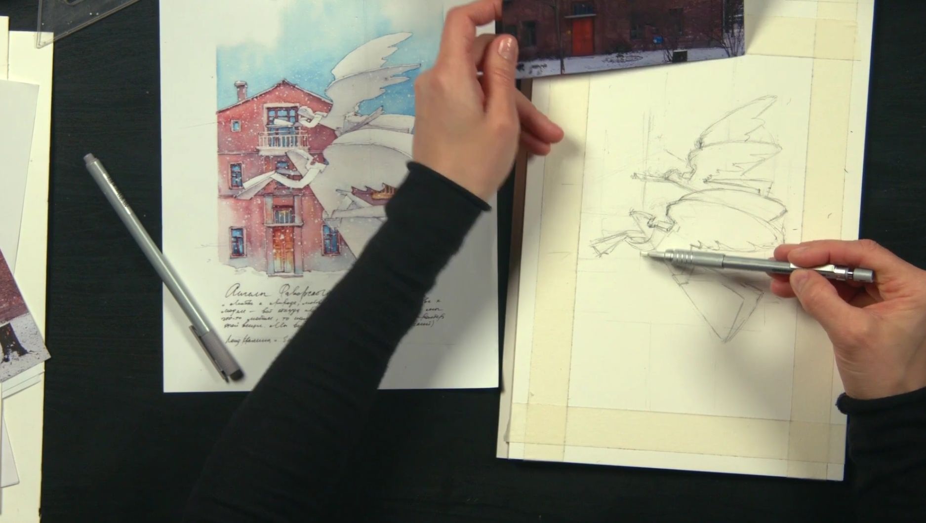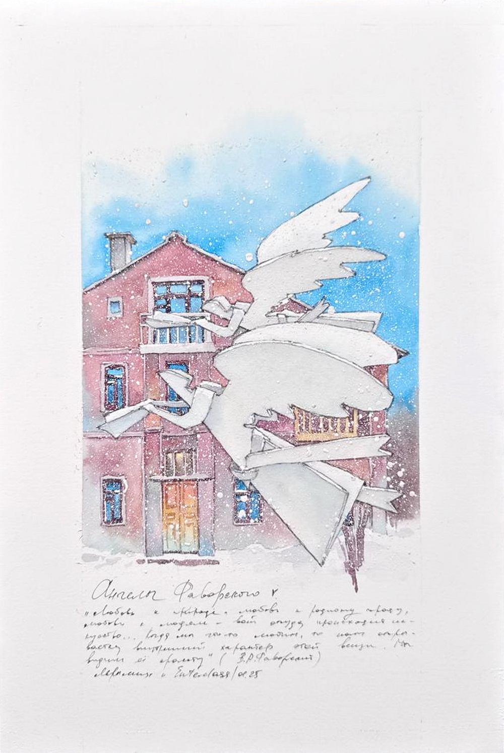 Вместе с Леной Крыминой создадим тёплый рождественский сюжет с ангелами Фаворского. Сначала вырежем из бумаги ангелов. Затем соберём композицию на листе, отрисуем и проработаем сюжет акварелью: одновременно и графично, и живописно. Уделим отдельное внимание фактуре ангелов: чтобы не потерять их хрупкость и осторожно распределить контрасты. И в финале добавим текст, который сделает из нашей работы настоящую иллюстрацию: совсем как в книжке, которую можно разглядывать в уютный зимний вечер.