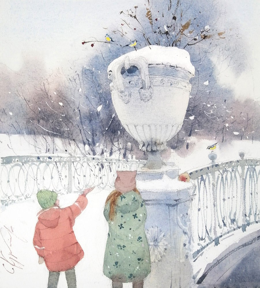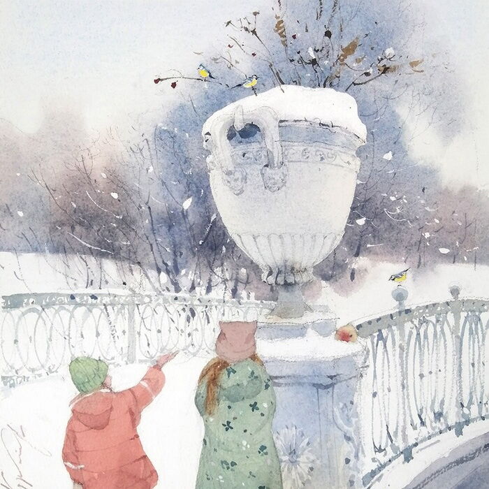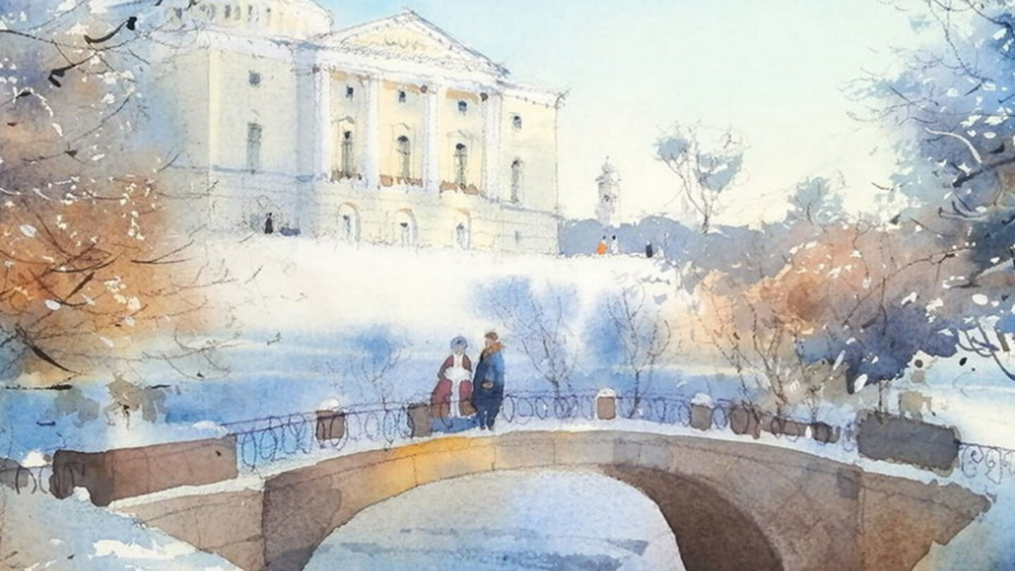 Профессиональный набор акварели от 24 цветов следующих марок: Enterclass, Гамма, Pinax, Белые ночи, Schmincke, Van Gogh, W&N, Lukas или др. Краски могут быть в кюветах или в тюбиках. Понадобятся следующие цвета акварели (из Невской палитры): охра желтая, неаполитанская желтая, кадмий жёлтый, лимонная желтая, охра красная, сиена жжёная, железноокисная светло-красная, умбра жжёная, гематитовая дымка, розовый хинакридон, королевская голубая, кобальт синий, серо-розовая дымка, голубая ФЦ, ультрамарин, индиго, голубой горизонт Pinax, магнолия или коралловая, окись хрома, кость жжёная, белила титановые, майская зеленая, кадмий красный, таёжная дымка, сепия, золотистый оранжевый.