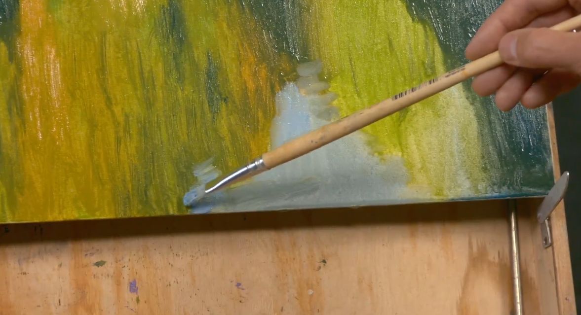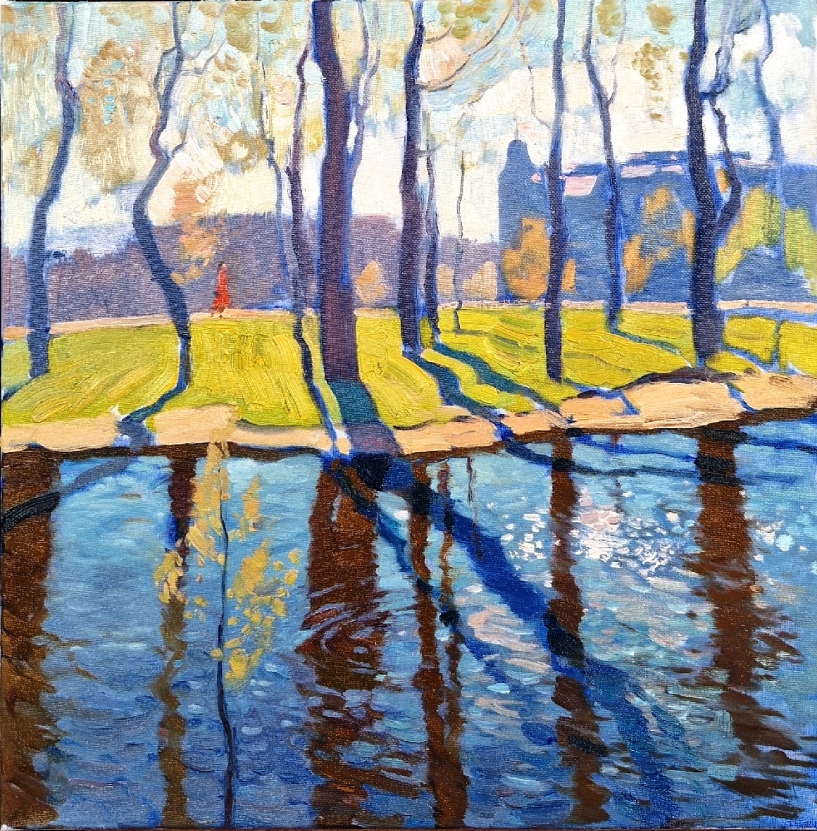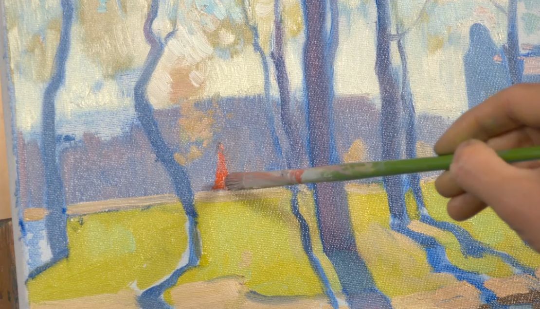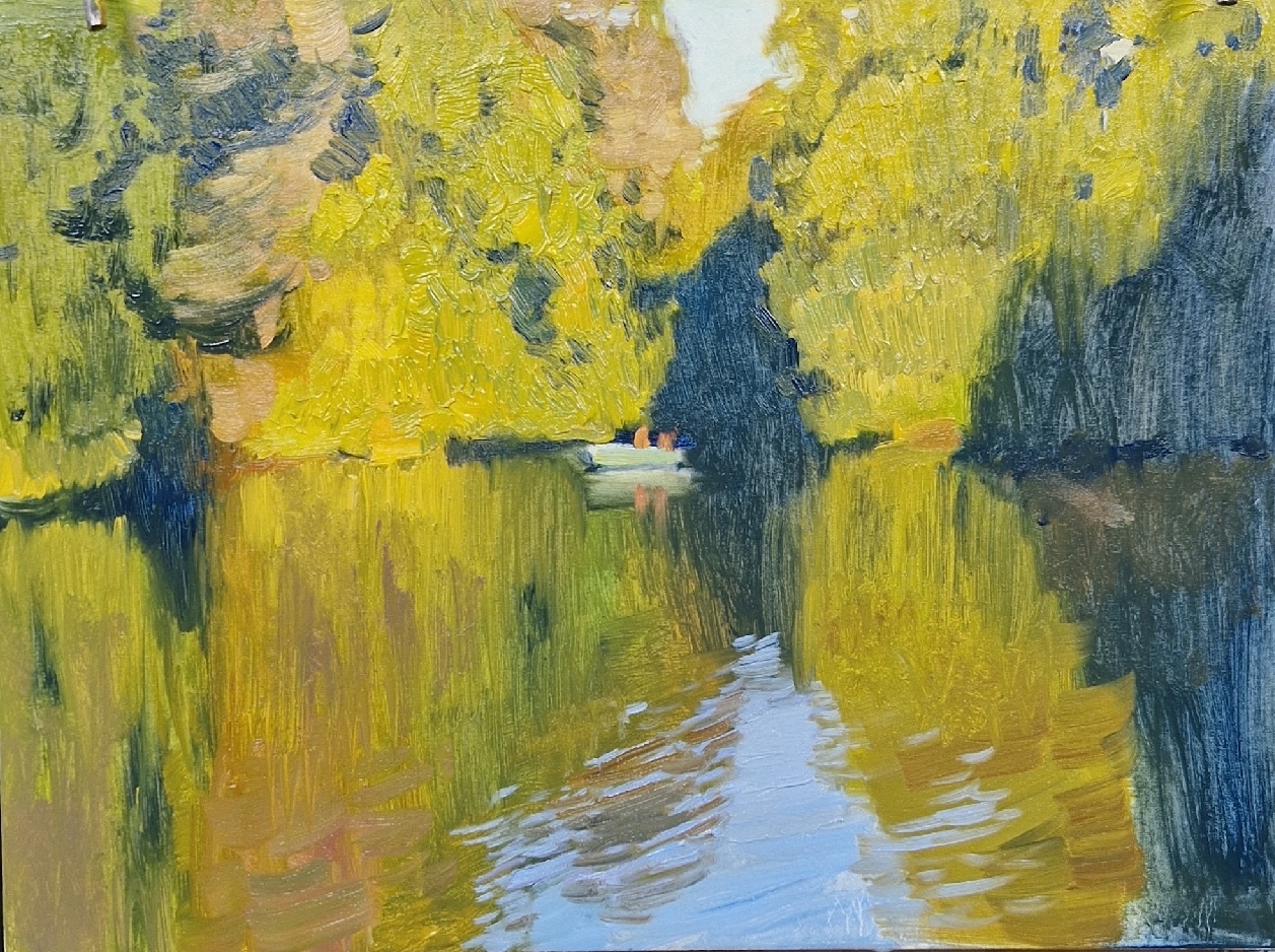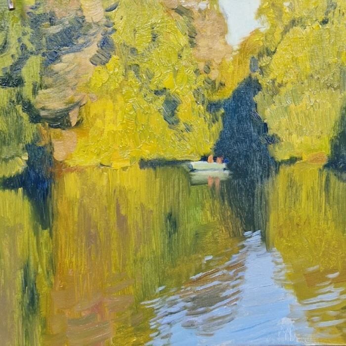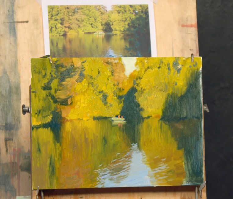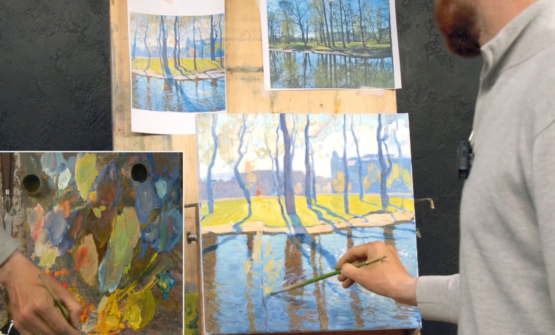 В первом уроке напишем масляными красками небольшой этюд на состояние: постараемся передать солнечный свет на деревьях и отражение в воде. Потренируемся брать большие цветовые и тональные отношения, а также работать с разным мазком, добиваясь нужной нам живописной фактуры.