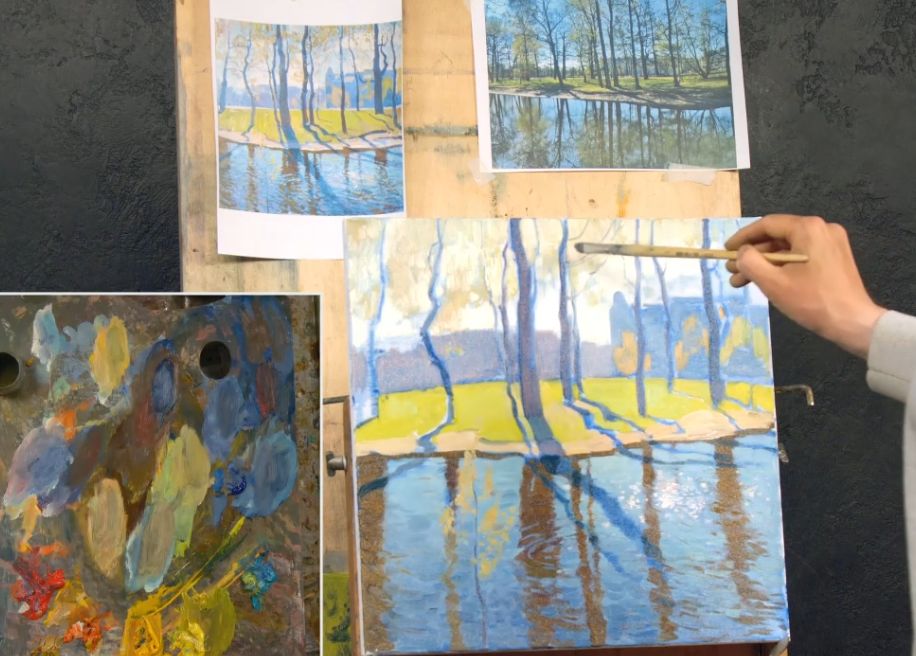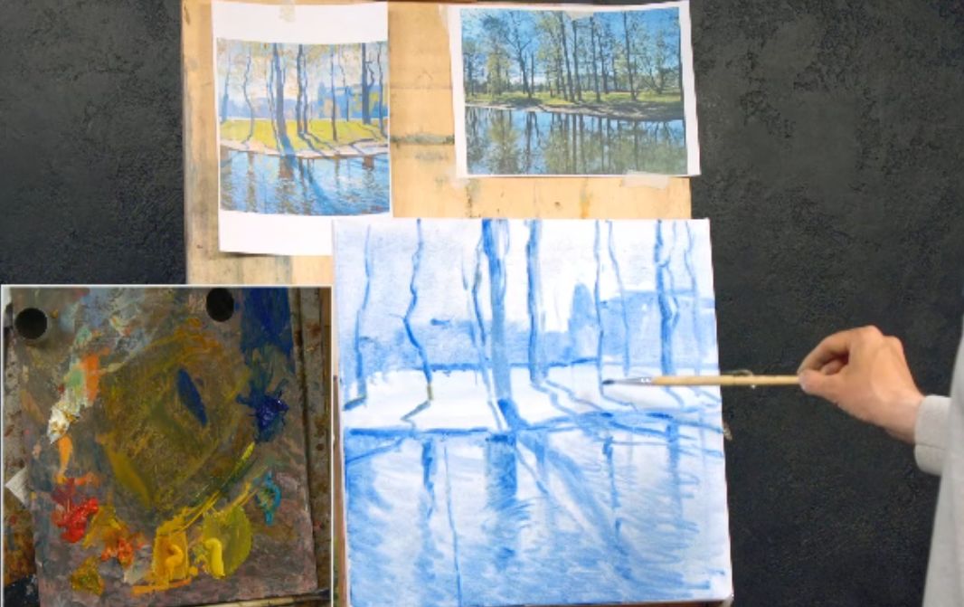 В основное время онлайн мастер-класса художникаа напишем маслом весенний пейзаж с деревьями, которые отражаются в воде. Попробуем реалистично изобразить контражурное освещение, а главное — сделать "живую" воду, чтобы она играла и переливалась как в жизни. Не срисовывая с фото и не копируя действительность, научимся передавать ощущение воды, света, воздуха через цвет и фактуру. Поговорим, что такое ритм в пейзаже, как выстроить пятно, чтобы композиция "держалась", и почему иногда цвет "работает", а иногда "не работает", превращаясь в глухой тон. Разберём основы теплохолодности и поговорим о цветовой гармонии на основе ограниченной палитры.