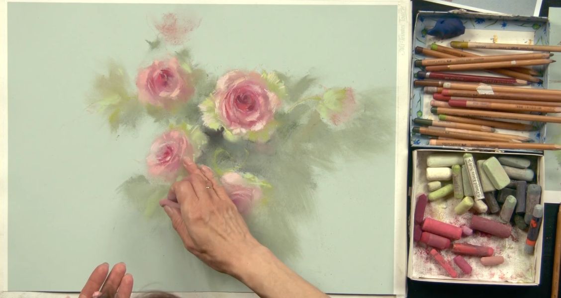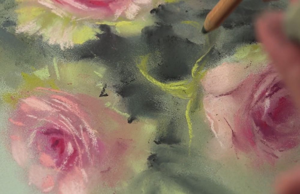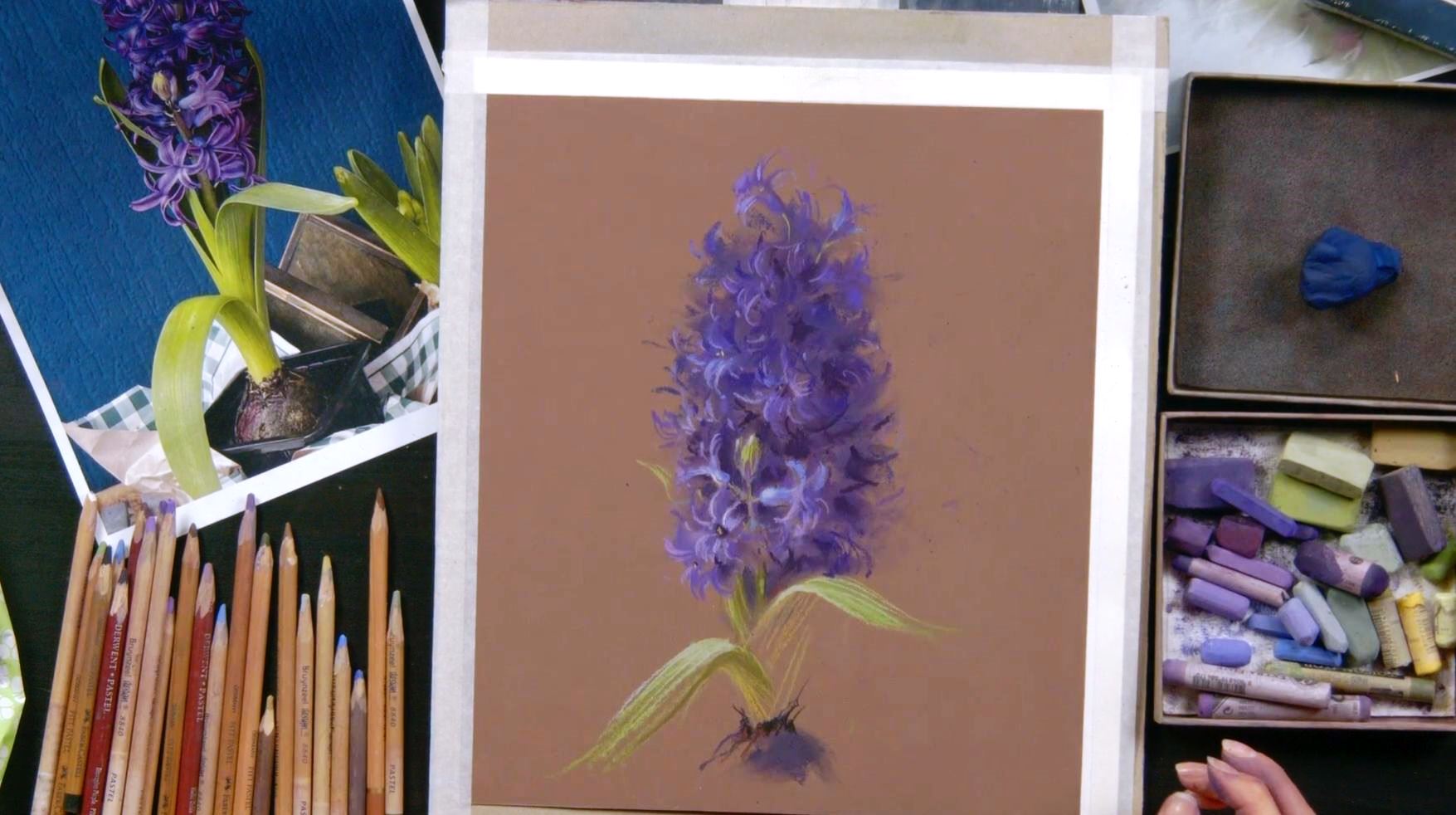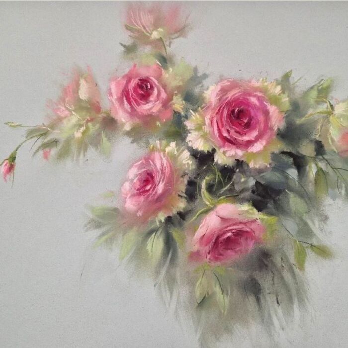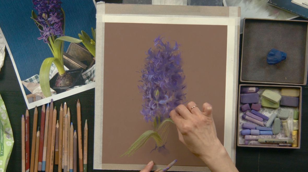 Также понадобятся пастельные карандаши (у Татьяны — Dervent, Bruynzeel design, Faber-Castel) таких же оттенков, как и мелки. Фото карандашей для гиацинта ЗДЕСЬ, для роз — ЗДЕСЬ.