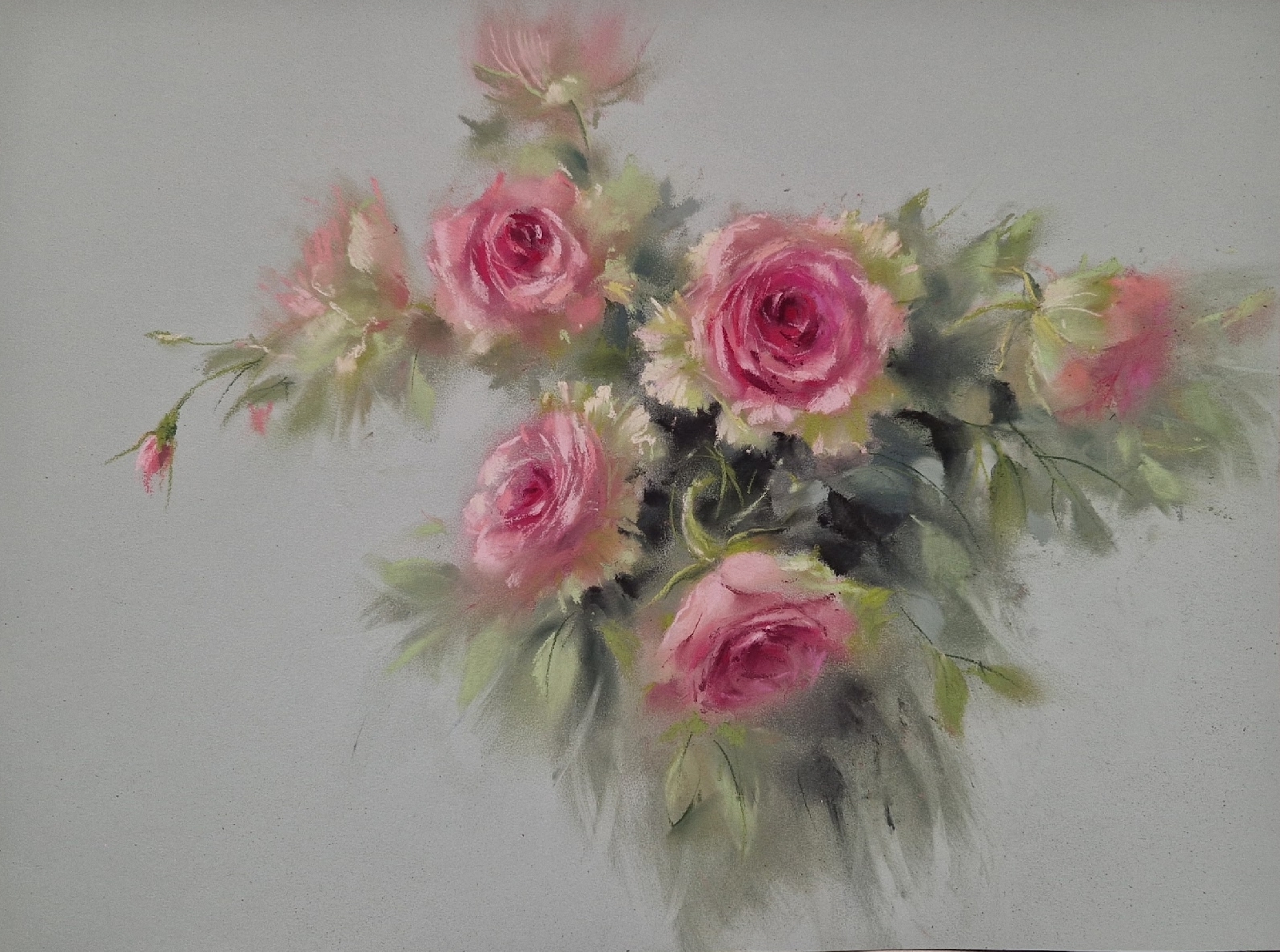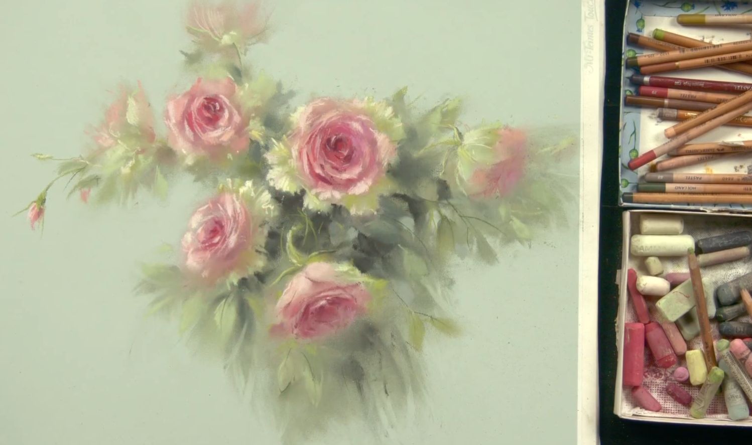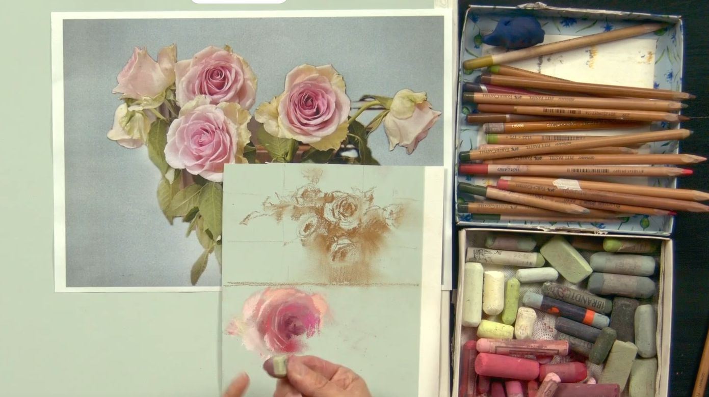 Также понадобятся пастельные карандаши (у Татьяны — Dervent, Bruynzeel design, Faber-Castel) таких же оттенков, как и мелки. Фото карандашей для гиацинта ЗДЕСЬ, для роз — ЗДЕСЬ.