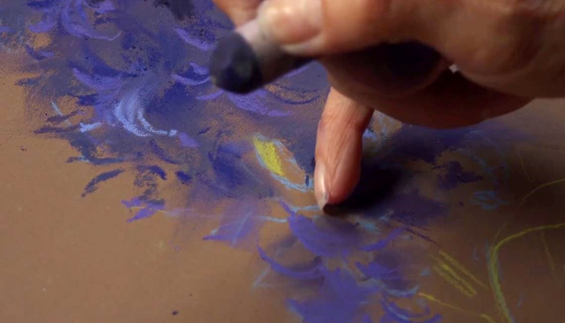 Для первой части урока понадобится сухая пастель любых марок (Татьяна использует Rembrandt, Sennelier, Unisoncolor, Earthberry, Гамма, Mungyo). Основная гамма мелков: фиолетовые оттенки (от светлых до тёмных), бордовый, ультрамариновый, серо-фиолетовый, зелёный, светло-зелёный, оливковые, жёлтый, серо-зелёный холодный, серо-голубой. Фото мелков ЗДЕСЬ.