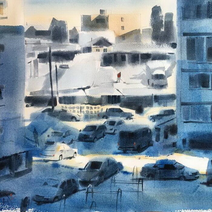 В начальной части мастер-класса Дениса Петруленкова разрисовываемся — делаем небольшие упражнения акварелью: рисуем окна в многоэтажных зданиях, автомобили... Выясняем их важность в современном пейзаже и влияние на общее впечатление от работы. Затем Денис разбирает работы начинающих художников — акцентирует внимание на интересных находках, подсказывает, как исправить типичные ошибки в тоне и композиции. В основной части видеоурока напишем акварелью городской пейзаж в необычном ракурсе в ограниченной палитре по сырой бумаге.