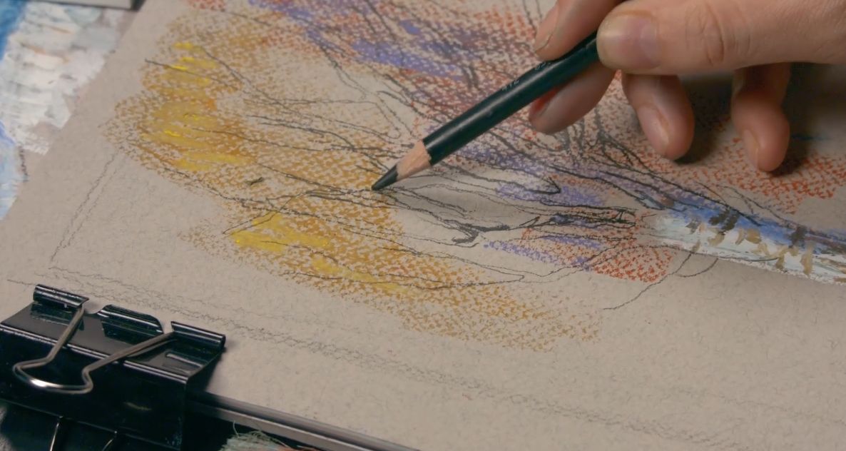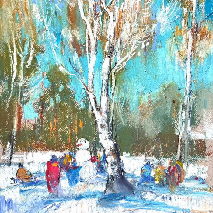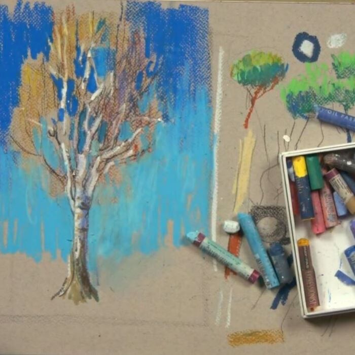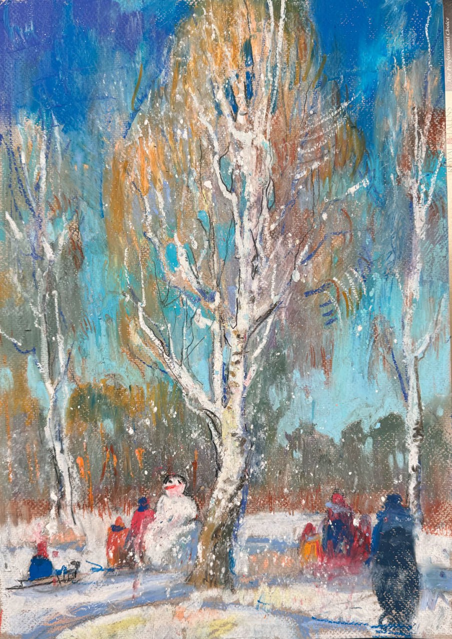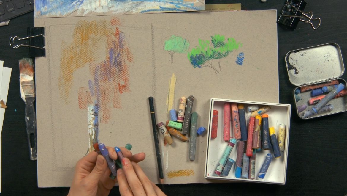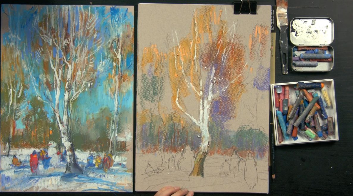 В основной части эфира нарисуем масляной пастелью солнечный зимний пейзаж и на практике разберемся, какого цвета палитра зимы и почему снег не белый, как подобрать цветовую палитру для работы и как добиться чистого цвета, как писать деревья, не прорисовывая веточки, как писать сложные объекты на фоне (деревья на фоне неба).