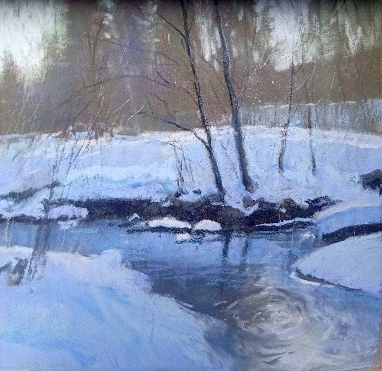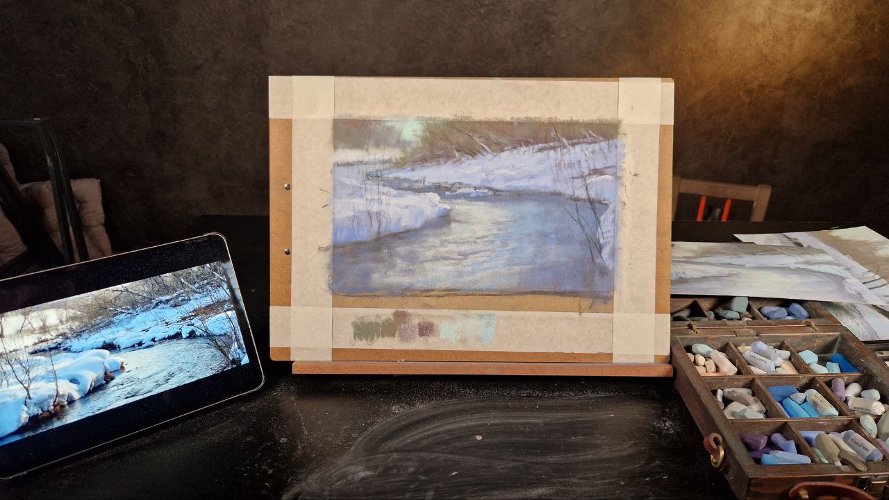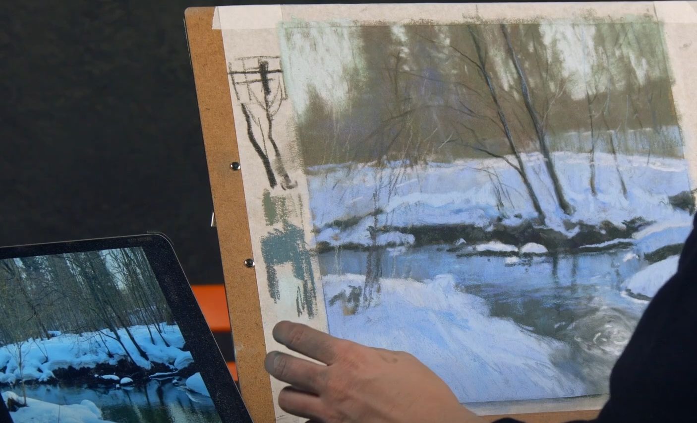 Понадобится сухая мягкая пастель, например, EARTHBERRY, Sennelier, nuanсe, Rembrandt, Малевич, Mungyo Isabelle Lim. Оттенки неба: светло-голубые, бледно-желтые, серо-голубые. Оттенки снега: серо-голубые, ультрамарин светлый, серый, белый,серо-сиреневый, серо-фиолетовый, бело-розовый. Оттенки леса, воды, берега: серо-зеленый, серо-коричневый, серо-розовый, коричневый, серо-фиолетовый темный. Фото материалов для первой части урока ЗДЕСЬ, ЗДЕСЬ и ЗДЕСЬ. Фото материалов для основного сюжета ЗДЕСЬ и ЗДЕСЬ.